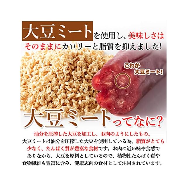 【大豆ミートってなに?】油分を圧搾した大豆を加工し、お肉のようにしたものです。油分を圧搾した大豆を使用している為、脂質がとても 少なく、たんぱく質が豊富な食材です。お肉に近い味や食感でありながら、大豆を原料としているので、植物性たんぱく質や食物繊維も豊富に含み、健康志向の食材として注目されています!!見た目は普通のカルパスですが、従来品に比べて…カロリー約39.9%オフ!脂質約67.5%オフ!!こだわりの大豆ミート入りカルパスです。(同一メーカー従来品100gと比較 ※目安)