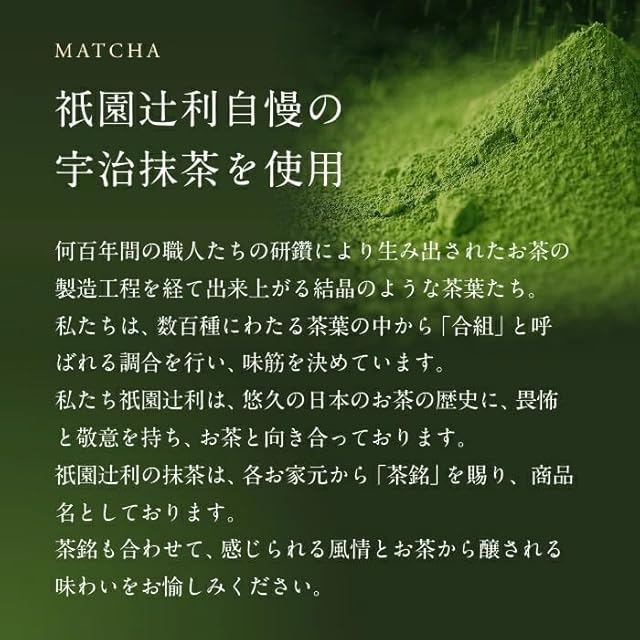 【祇園辻利について】1860年(萬延元年)、屋号を初代・辻利右衛門の名より「辻利」とし、宇治(現・京都府宇治市)にて宇治茶の製造と販売を開業したことに始まります。