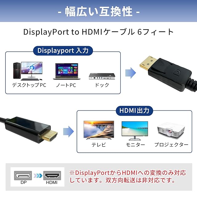 【DisplayPort to HDMI変換ケーブル】DisplayPort to HDMI変換ケーブルは、DisplayPortを搭載したデスクトップPCやノートPCなどからHDMIポートを持つテレビやモニターなどにデータを変換して伝送します。 ※双方向の信号転送に非対応(単方向)のため、DisplayPortからHDMIポートへの変換のみです。 ※HDMIポートからDisplayPortには変換できません。お間違いのないようご注意ください。 本製品はパッシブタイプの変換アダプタです。ご使用のPC側の DisplayPort が DP++ (DisplayPort デュアル・モード)機能に対応していない場合はご使用いただけません。