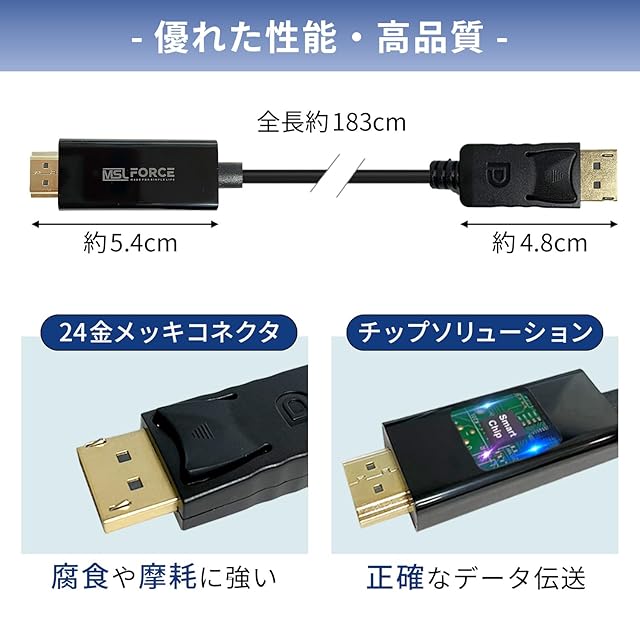 【優れた安定性】24k金メッキ処理を施したDisplayPortオスおよびHDMIコネクタは腐食や摩耗、サビに強いです。多重シールド処理によって信号のロスやノイズ等を最低限まで抑え、安定した映像音声を提供します。