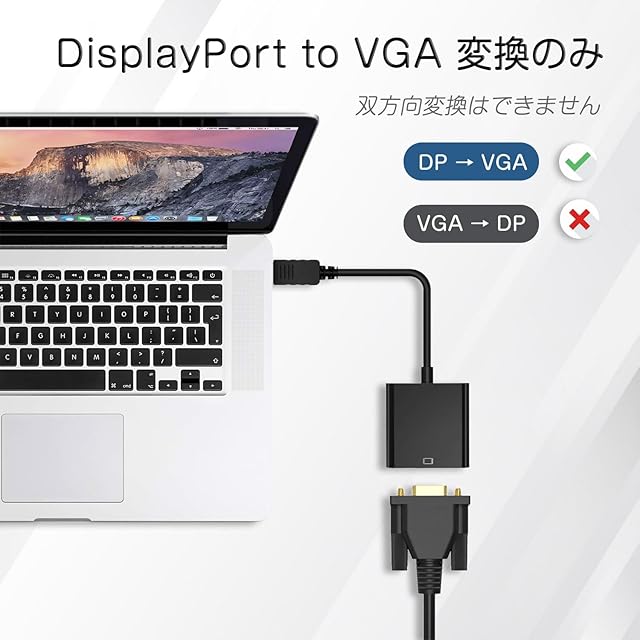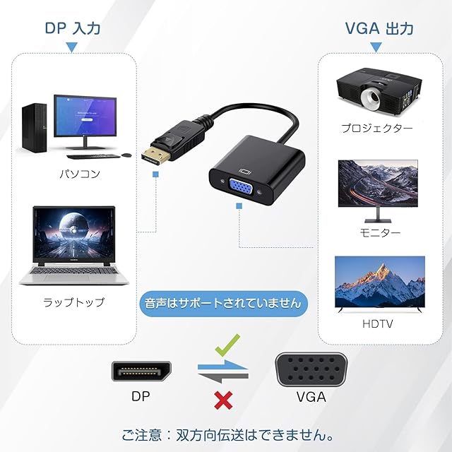 【DP to VGA変換のみ】本製品はDisplayPortからVGAへの変換のみをサポートしており、VGAからDisplayPortへの変換には対応していません。また、双方向の変換はできません。VGA出力のパソコンからディスプレイモニタのDisplayport への入力はできません。音声出力には対応していません。