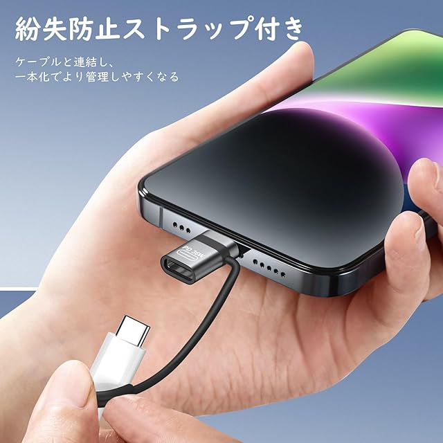 「シリコンストラップ付き」アダプター本体に紛失防止用のシリコンストラップが付いてある仕様となります。決まったケーブルとアダプタのセットを連結し、バラバラにならず一本化でより管理しやすくなり、紛失や盗難にも防止できます。全体持ち運び便利で重さもわずか3gの小型でコンパクトな設計に仕上がっており、自宅や勤め先ごとにそれぞれ用意することをおすすめいたします。(ストラップは取り外しできない仕様であることをご了承の上お買い求めください。)
