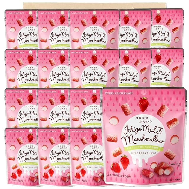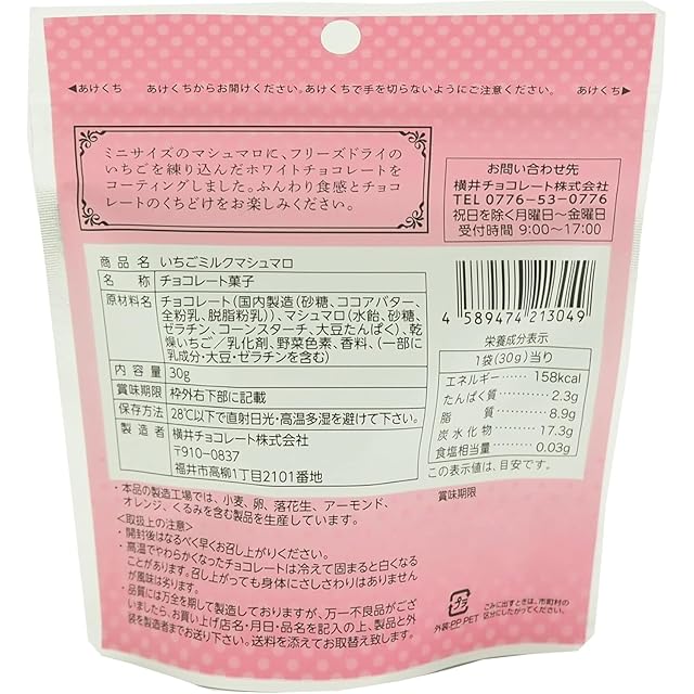 チョコレート(国内製造(砂糖、ココアバター、全粉乳、脱脂粉乳))、マシュマロ(水飴、砂糖、ゼラチン、コーンスターチ、大豆たんぱく)、乾燥いちご/乳化剤、野菜色素、香料、(一部に乳成分・ゼラチン・大豆を含む)