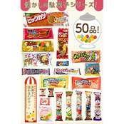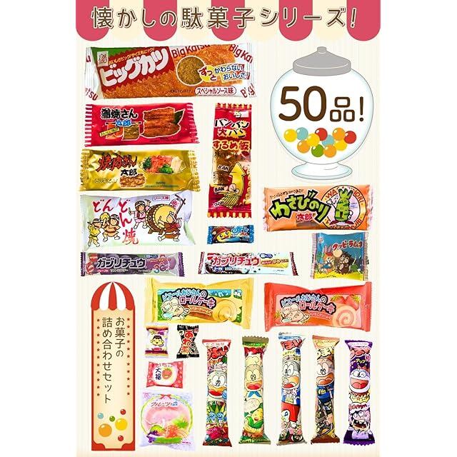 駄菓子と大人気のお菓子50点、入るだけ詰め込んでおります!!お菓子の中の最短の賞味期限を、箱底面に記載しております!