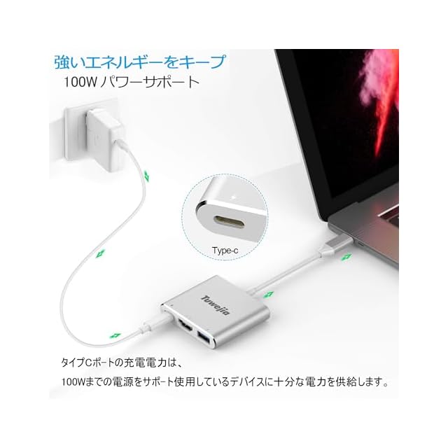 【USB Type-C HDMI 変換アダプター 3in1ー2025版】:Tuwejia USB C Type C To HDMIへのアダプターは、パソコンやタブレットのUSB Type-CポートをHDMI 4K@30Hz出力ポート、PD 100W充電ポート(充電のみ対応、映像出力非対応)、USB-A 3.0ポートに拡張します。iPhone 15やiPadの画面をテレビ、プロジェクター、モニターにミラーリングします。すべてのポートが同時に動作します。ソフトウェアやドライバー、複雑なインストールプロセスは不要です。充電、データ転送、映像・音声出力が楽しめます。展示会、プレゼンテーション、ホームシアターエンターテイメント、オフィス、旅行などに最適です。