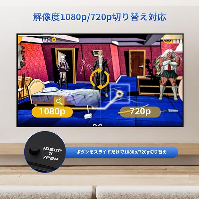 解像度切り替え:720p/1080p解像度と4:3/16:9画面サイズの切り替えをサポートします。 スイッチひとつで自分の好みに合わせて表示比率を変更し、さまざまなゲーム効果を体験できます。