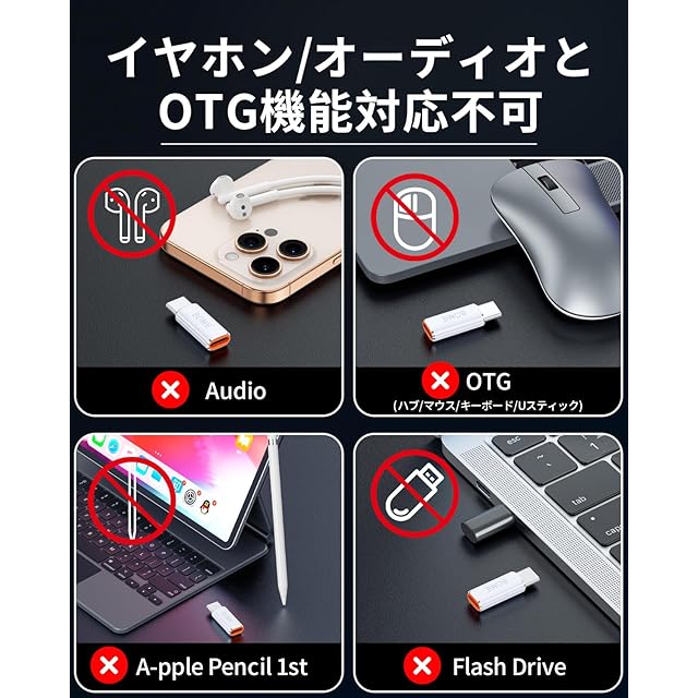 非互換デバイス:このタイプc 変換はデバイスとの互換性がなく、ヘッドフォンオーディオ機能、OTG機能、ビデオ、A-pple Pencil(第一世代)、マウス、キーボード、フラッシュドライブ、カードリーダー、プリンタ、マイク、カメラ、その他のデバイス接続には対応していません。