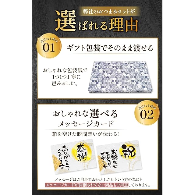 ✅【ギフト包装に選べるメッセージカード付き】従来のおつまみギフトはギフト包装されてないのを改善!カザリスのおつまみギフトは全商品丁寧に包装紙でラッピングしてお届けいたします。また選べるメッセージカード付きでお贈りする方の想いもいっしょにお届け致します♪