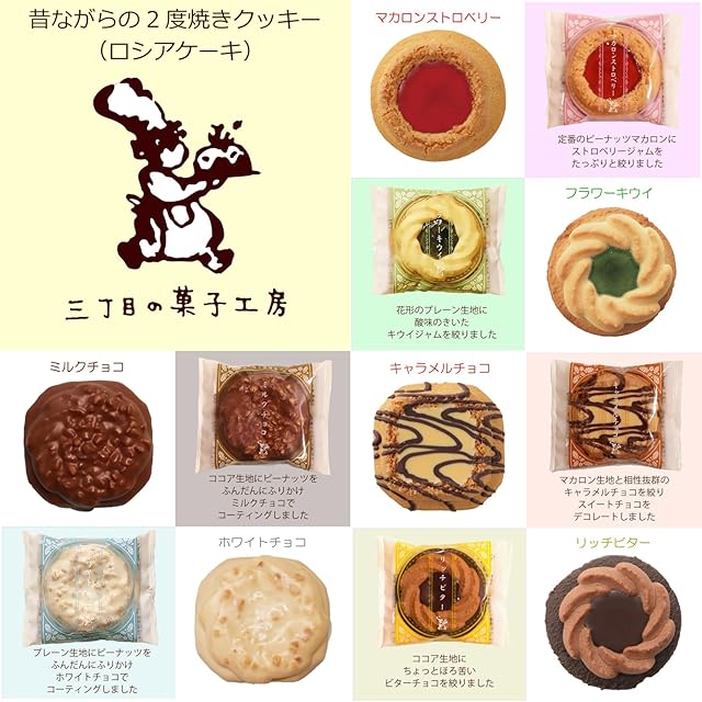三丁目の菓子工房のオリジナル個包装。裏面に原材料・賞味期限・栄養成分を表示しています。