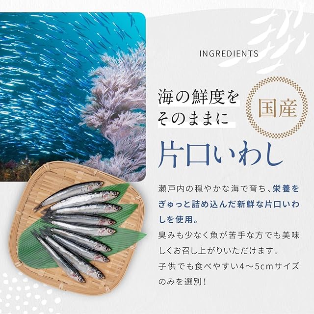 小魚は無添加で、醤油、水飴を使わない自然な味わいで、国産(瀬戸内海・九州)片口いわしのみを使用。