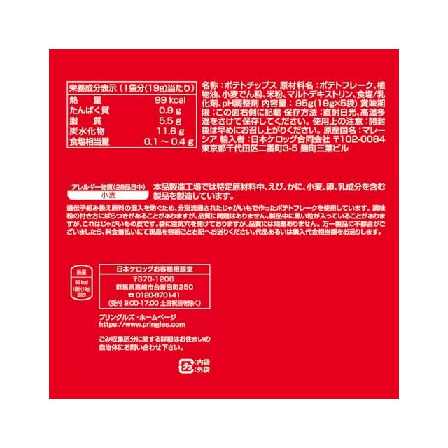 1袋分(19g)当たり:熱量・・・99kcal,たんぱく質・・・0.9g,脂質・・・5.5g,炭水化物・・・11.6g,食塩相当量・・・0.1~0.4g