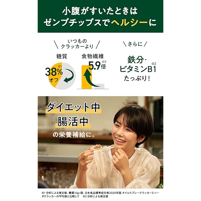 ☕低糖質、食物繊維たっぷり※2 :いつものクラッカーより食物繊維5.9倍、糖質30%オフ、塩分50%オフ、鉄分5.2倍(※2)。※2:分析による推定値。日本食品標準成分表2020年版オイルスプレークラッカーとソーダクラッカーの平均(100g当たり比較)。チップス1袋24g当たり糖質10.0g。チップス100gあたり食物繊維12.5g、糖質41.8g、食塩相当量0.8g、鉄分3.9mg