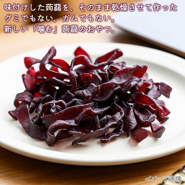 【「噛む」こんにゃくのおやつ】味付けした国産蒟蒻を、そのまま乾燥させて作った、ちょっと硬いグミのような食感の「噛む」こんにゃくの新しいおやつです。手でつまんでも汚れないのもうれしいポイント!普段のおやつに、おつまみに、ダイエット中のお供に。国産蒟蒻使用。