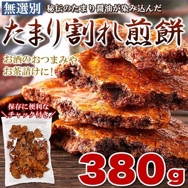 ※ご了承ください。 あえて割り、タレを断面に染み込ませた煎餅を「無選別」で380g詰めてお届け致します。 また簡易包装の為、配送時などの衝撃でさらに割れや欠けが生じる可能性がございますので、 予めご了承の上、お買い求めください。