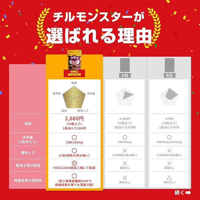 【“チル”の裏には、徹底した安全管理】 グミの製造は国際的な食品安全管理基準「FSSC22000」認証取得の国内工場で製造。 また、THCの検査は原料輸入時と最終製品の両方をアメリカの大手第三者機関で分析済み。 日本の法律基準を順守しているため、安心してご利用いただけます。