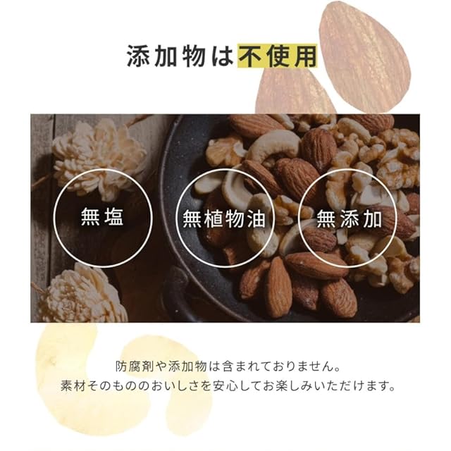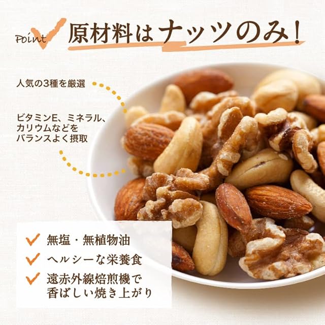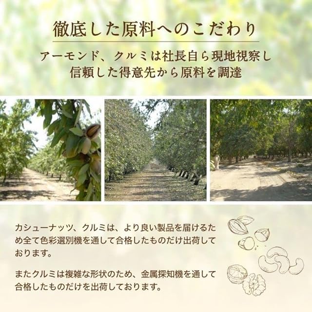 アーモンドとカシューナッツは素焼きです。クルミは生です。