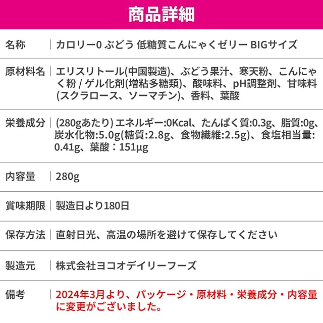 【原材料名】エリスリトール(中国製造)、ぶどう果汁、寒天粉、こんにゃく粉/ゲル化剤(増粘多糖類)、酸味料、pH調整剤、甘味料(スクラロース、ソーマチン)、香料、葉酸