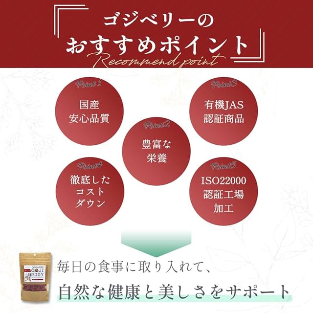 ✅【有機JAS認定クコの実100%使用】有機JAS認定されたクコの実100%使用。人工着色料、人工甘味料、添加物、保存料は一切使用していません。遺伝子組み換え作物不使用、ビーガン、ベジタリアンの方に。