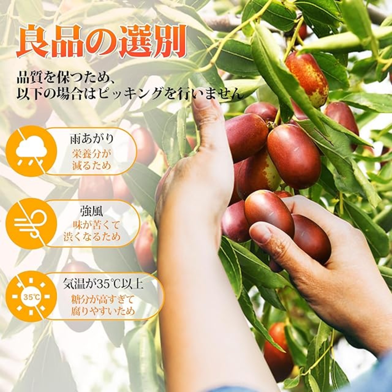 【自然植栽、無添加】天然の雪解け水と人工除草により自然栽培されているなつめを原料としています。 8,000平方メートルの大型工房で専門的に加工・滅菌・包装されており、無添加で棗本来の風味があり、栄養成分を残すことができるなつめチップス 無農薬なので、安心してお召し上がりいただけます。