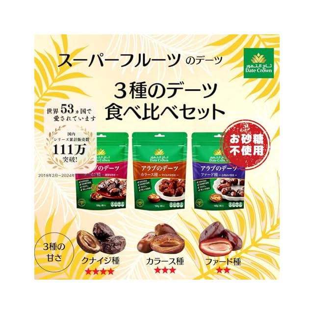 【デーツクラウン3種のデーツを食べ比べ】まるで黒糖・干し柿のような天然の甘味と綺麗なブラックの色が特徴のクナイジ種。カラース種味は、キャラメルのようなマイルドな甘さで、皮も口に残りにくく、セミドライで柔らかい。ファード種は、グミのような食感と甘さが控えめのお味のデーツです。お口の中で噛んでいると、上品なくせの無い甘さがお口に広がります。
