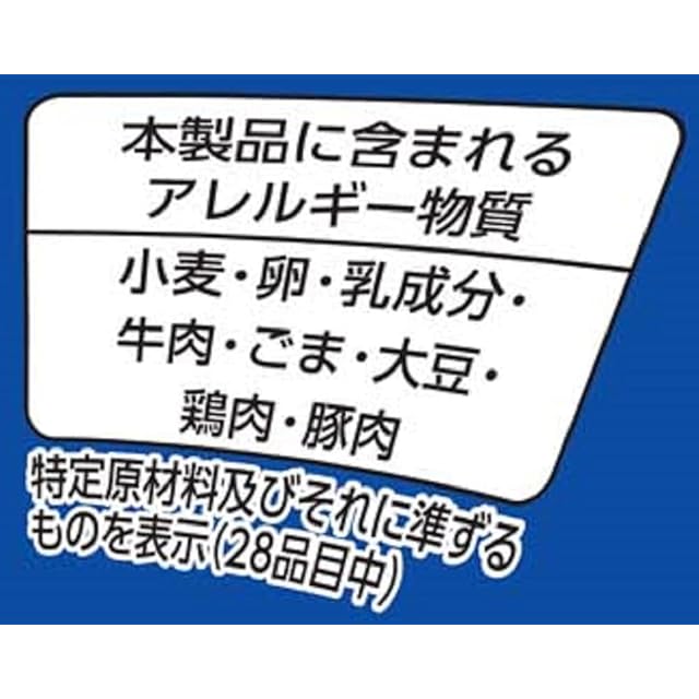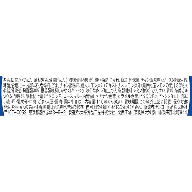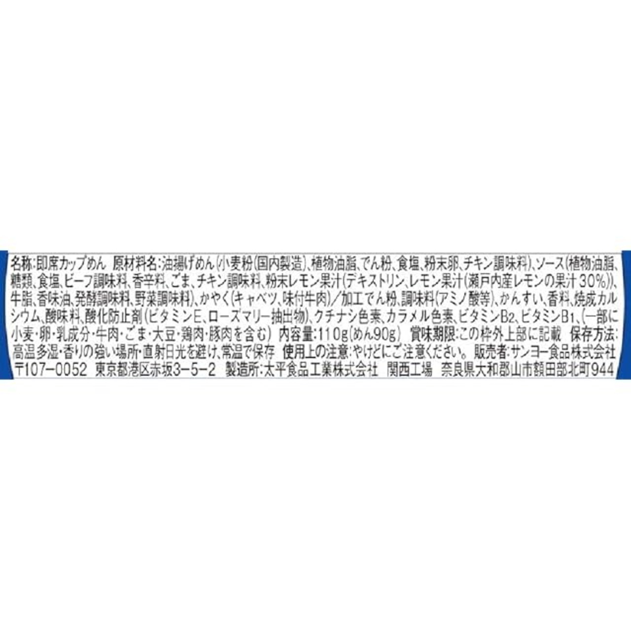 原材料:油揚げめん(小麦粉(国内製造)、植物油脂、でん粉、食塩、粉末卵、チキン調味料)、ソース(植物油脂、糖類、食塩、ビーフ調味料、香辛料、ごま、チキン調味料、粉末レモン果汁(デキストリン、レモン果汁(瀬戸内産レモンの果汁30%))、牛脂、香味油、発酵調味料、野菜調味料)、かやく(キャベツ、味付牛肉)/加工でん粉、調味料(アミノ酸等)、かんすい、香料、焼成カルシウム、酸味料、酸化防止剤(ビタミンE、ローズマリー抽出物)、クチナシ色素、カラメル色素、ビタミンB2、ビタミンB1、(一部に小麦・卵・乳成分・牛肉・ごま・大豆・鶏肉・豚肉を含む)