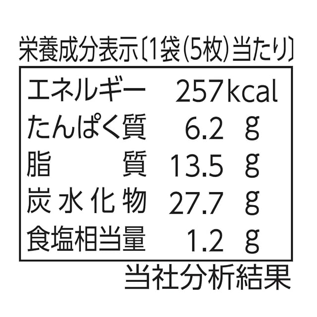 原材料:小麦粉(国内製造)、植物油、でん粉、パン粉(乳成分・大豆を含む)、いか(魚介乾製品)、砂糖、食塩、胚芽、植物性たん白、香辛料、酵母エキス、卵白、全卵粉末/調味料(アミノ酸等)、膨脹剤、トレハロース、乳化剤、甘味料(ステビア、カンゾウ)、香料、着色料(カロチノイド)