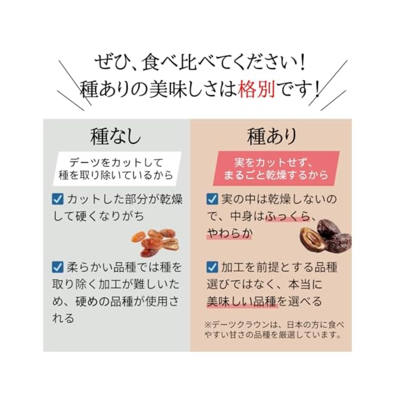 【本来のデーツの味を楽しむ】デーツクラウンのデーツは、種入りです。種抜きは実をカットするため少し硬い食感ですが、デーツクラウンは種入りのためデーツ本来の柔らかさを味わうことができます。本場のデーツを本場の食べ方で、それがデーツクラウンのこだわりです。無添加、砂糖不使用、オイル不使用、非遺伝子組換え、残留農薬検査済(日本)のデーツです。