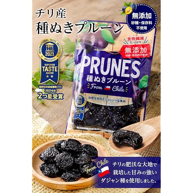 ✅【高品質で美味しいチリ産プルーン】四季と昼夜の寒暖差が大きいチリは、美味しいプルーンが育つ条件が揃っています。その美味しさは食品のミシュランガイドとしても知られているITI(国際味覚審査機構)でも認められて、優秀味覚賞で2つ星を受賞しました。