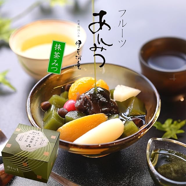 内容量:フルーツ黒蜜あんみつ(角心太95g、餡35g、蜜25g、フルーツ)×1、フルーツ白蜜あんみつ(角心太95g・餡35g・白蜜20g、フルーツ)×1、フルーツお抹茶かさね(抹茶入り角心太95g、餡35g、抹茶蜜25g、フルーツ)×1、ほうじ茶あんみつ(ほうじ茶入り角心太95g、餡35g、ほうじ茶蜜25g)×1 計4個