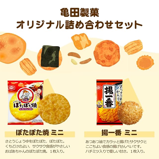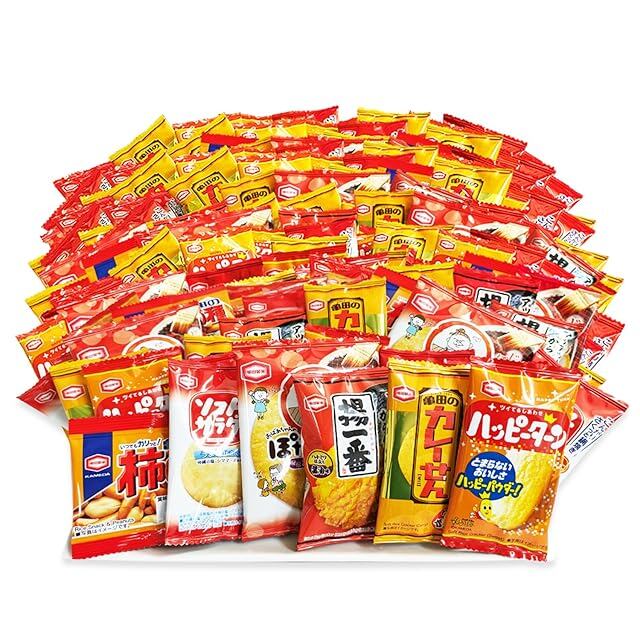 【セット内容】ハッピーターン(4g)20個、亀田のカレーせん(2.7g)20個、ソフトサラダ(2.6g)20個、柿の種 (9g)20個、ぽたぽた焼き (1枚)10個、揚一番(1枚)10個