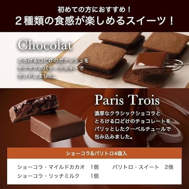 【1秒に77個売れた代表作】濃厚な生チョコレートをサクサクのバタークッキーでサンドした「ショーコラ」と、3層のチョコレートが織りなす濃厚な味わいの「パリトロ」の2種類が入った、当店一番人気のアソートセットです。ちょっとしたギフトにぴったりのサイズ感です。※2024/3/5 20:00-20:02 12,720個販売
