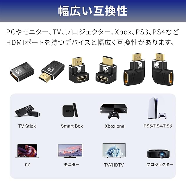 【幅広い互換性】 PC/モニター/プロジェクター/メディアプレーヤー/Switch/PS4/PS5/Xbox One/HDTVなど様々なHDMIデバイスに対応します。 ※スマートフォンからモニターなどに映像を映し出す場合は対応する変換ケーブルをご使用ください.