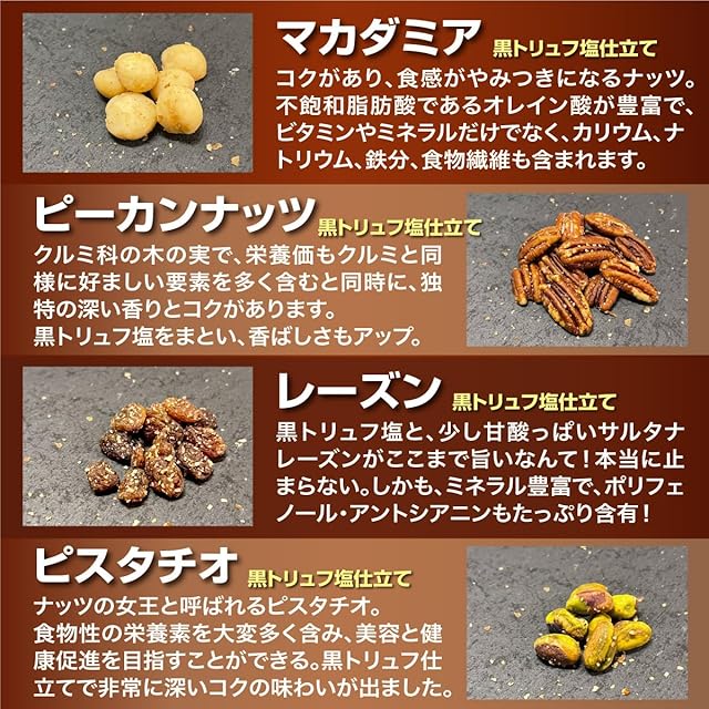 【商品内容】Terraris(テラリス) 贅沢7種の黒トリュフ塩ミックスナッツ 黒トリュフ塩仕立て 大人なナッツは、お酒のおつまみナッツとして非常に美味しく、トリュフ塩ナッツで7種類の配合は当店のみ!カシューナッツ アーモンド くるみ ピーカンナッツ マカダミアナッツ レーズン ピスタチオ の贅沢7種 大満足の内容量!ギフト包装設定で、贈り物にも出来ます。