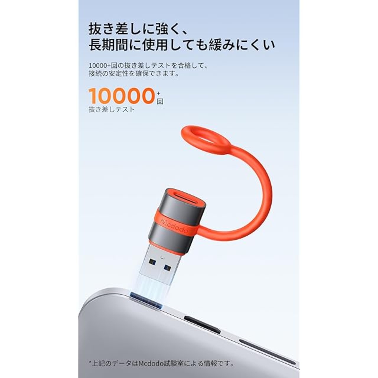【抜き差しに強く、長期間に使用しても緩みにくい】:10000+回の抜き差しテストを合格して、接続の安定性を確保できます。※上記のデータはMcdodo試験室による情報です。【合金材質、美しさと実用性を両立】:アルミ合金のマットな素材、頑丈で耐久性があり、圧力や指紋に強いです。【安心の品質保証】:Mcdodo製品は、12ヶ月の保証がついています。ご不明な点やお困りのことがございましたら、お気軽にメールにてお問い合わせください。24時間以内に迅速に対応させていただきます。(注文番号が保証書の代わりになります)。【パッケージ内容】:Mcdodo 5Gbps高速データ転送 USB-C to USB-A 3.0 変換アダプタ*1つ、保証カード*1つ