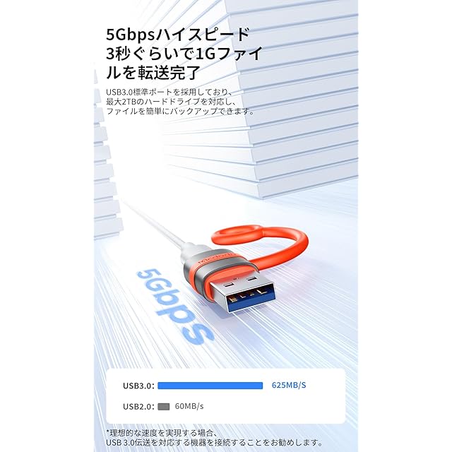 【5Gbpsハイスピード、3秒頃で1Gファイルを転送完了】:USB3.0標準ポートを採用しており、最大2TBのハードドライブを対応し、ファイルを簡単にバックアップできます。※理想的な速度を実現する場合、USB 3.0伝送を対応する機器を接続することをお勧めします。