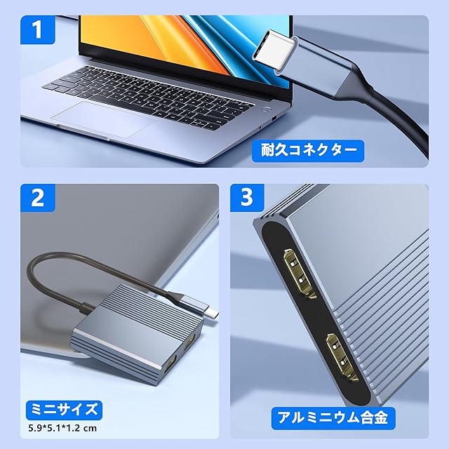 【複数のモニタで作業効率をアップ】 HDMI Type-Cマルチディスプレイアダプタを使用すると、ノートパソコンのUSB-Cポートに2台のHDMIディスプレイを接続できるので、マルチタスクが容易になります。デスクトップ画面を複数の外付けモニタに拡張したり、別々のコンテンツを各ディスプレイにストリーミングできるため、マルチタスクがしやすく、作業効率が向上します。また、複数のディスプレイに同じイメージをミラーリングし、デジタルサイネージなどの用途で活用することも可能です。(ラップトップのUSB CソースポートがDP Alt モードまたはThunderbolt 3/4を確認してください。)