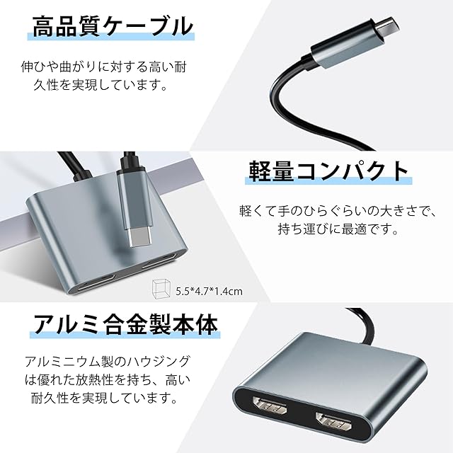 【Type-C変換アダプター HDMI 2ポート 最大3画面】複数のモニタで作業効率をアップ。最新型のノートパソコンは、非常に携帯性が高くなっていますが、その代わりビデオ出力ポートは少なく、使える画面がノートパソコン本体のスクリーンに限られてしまいます。このUSB C HDMI 変換マルチディスプレイアダプタを使用すると、ノートパソコンのUSB-Cポートに2台のHDMIディスプレイを接続できるので、マルチタスクが容易になります。デスクトップ画面を複数の外付けモニタに拡張したり、別々のコンテンツを各ディスプレイにストリーミングできるため、マルチタスクがしやすく、作業効率が向上します。(ラップトップのUSB CソースポートがはDP Alt モードまたはThunderbolt 3/4を確認してください。)