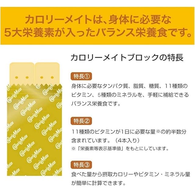 バランス栄養食 糖質、脂質、タンパク質、ミネラル類、ビタミン類をバランスよく含有しています。 美味しく、楽しく、どこででも食べられる 1本100kcalなので、カロリー計算が簡単です。保存性が高く、また携帯に便利なので、いつでもどこでもサポートします。