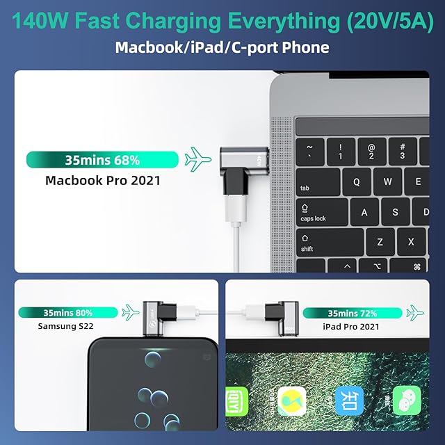 140W高速充電:この磁気充電器アダプターは、USB電源の5V/3A-28V/5A、最大140Wを提供します。これにより、すべてのUSB Cデバイスが最速の充電速度で安全に充電できます。