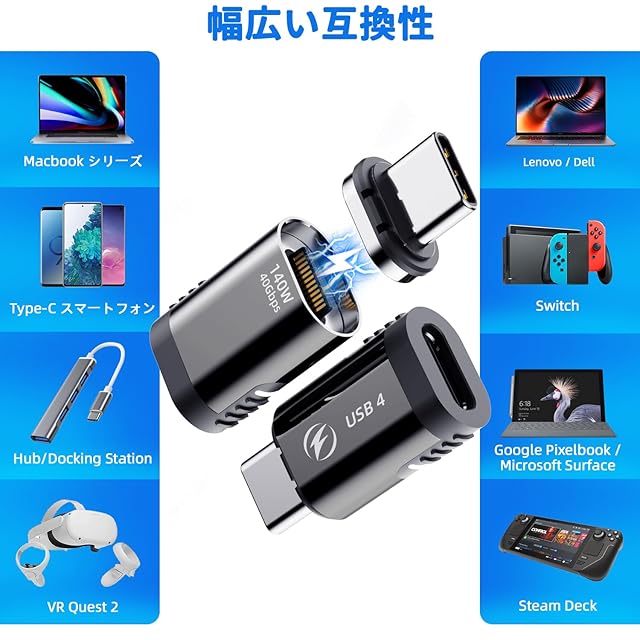 40Gbps および 8K@60Hz ビデオ: テクノロジーのアップグレードにより、DuHeSin の新しい磁気 USB c アダプターは、USB 4 の電力仕様とデータ転送速度をそのまま満たし、40Gbps のデータ転送速度をサポートします。 USB4 ケーブルを使用すると、USB タイプ C 磁気アダプターは 8K@60Hz HD ビデオとオーディオ出力をサポートします。ドッキングステーション/ハブでの使用はもちろん、クエスト2との相性も抜群です。