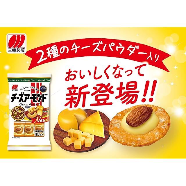 原材料:米(国産)、アーモンド、乳糖、植物油脂、ホエイパウダー(乳成分を含む)、しょうゆ(小麦・大豆を含む)、チーズパウダー(チェダーチーズパウダー59%、ゴーダチーズパウダー18%)、脱脂粉乳、砂糖、全粉乳、かつお節エキス、デキストリン、油脂加工品、でん粉/乳化剤、調味料(アミノ酸等)、香料、着色料(カロチン、パプリカ色素)、香辛料抽出物