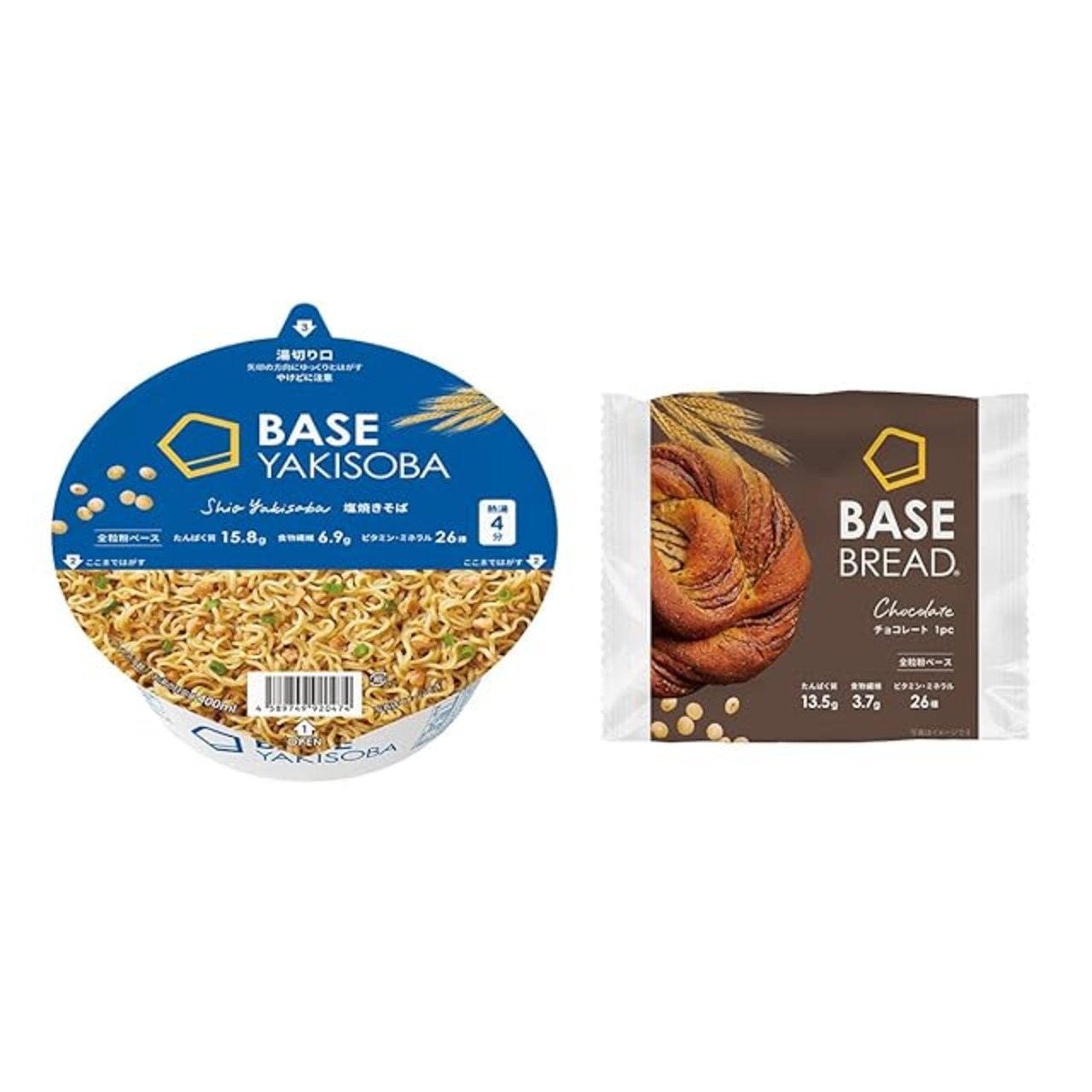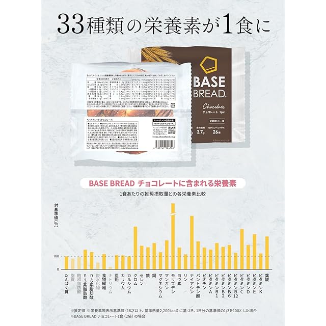 【ベースフード】チョコレートと塩焼きそばの焼きそばパンセット 【塩焼きそば】【チョコレート】全粒粉をベースに、大豆やチアシードなど、栄養豊富な自然食材を10種類以上ブレンド。 【BASE BREAD】 1食2袋で1日に必要な栄養素の1/3をすべてとれる完全栄養※1の低糖質パン※2 ※1 1食分(BASE BREADは2袋、BASE PASTAは1袋、BASE Cookiesは4袋、BASE YAKISOBAは2個、BASE Pancake Mixは1袋と卵Mサイズ1つ、牛乳(成分無調整)100mlを使用して調理した場合)で、栄養素等表示基準値に基づき、脂質・飽和脂肪酸・炭水化物・ナトリウム以外のすべての栄養素で1日分の基準値の1/3以上を含む。 ※2 BASE BREADチョコレートと、日本食品標準成分表2020年版(八訂)より、菓子パン あんなしとの比較(同量) アレルギー情報 〈ソース焼きそば〉小麦, 大豆, ゴマ, 豚肉 〈チョコレート〉小麦・卵・乳成分・大豆・ゼラチン
