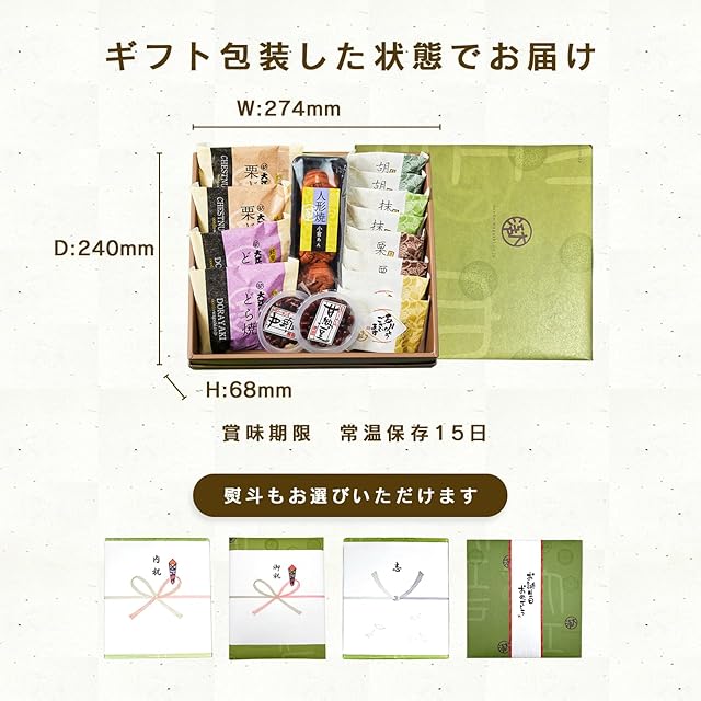 【商品詳細】内容量:きんつば(小豆/栗/抹茶/胡麻)各2個、どら焼 2個、栗どら焼 2個、人形焼(小倉4入)1個、甘納豆(能登産大納言)2個 / 賞味期限:14日 / 保存方法:常温 / 梱包方法 :化粧箱入り