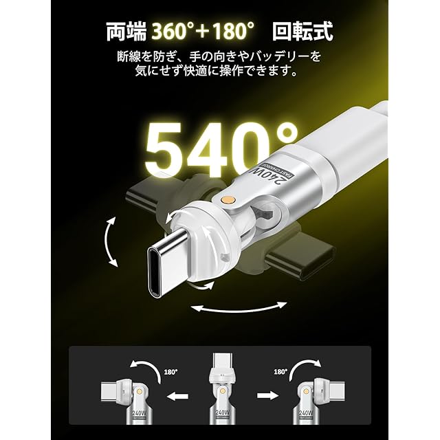 【L字型のデザイン & 540°回転可】特別のL字型、「左右180°」+ 充電接続口は【360°回転】のデザインを採用し、充電の角度を自由に調整できます。充電しながらゲームをしたり、動画を見たりする際、コネクタの接続部分が邪魔にならず、快適に楽しむことができます。不同長さの充電ケーブルは色々場所で利用ができます。