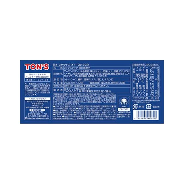 原材料:アーモンド、いわし、落花生、砂糖、植物油脂、食塩、ゴマ、水あめ、魚介パウダー、ドコサヘキサエン酸含有精製魚油、こんぶパウダー、香辛料、トレハロース、香料、調味料(アミノ酸等)、ビタミンD、 (原材料の一部にエビ、大豆を含む)