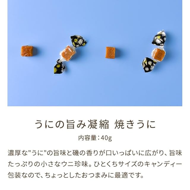 濃厚な"うに"の旨味と磯の香りが口いっぱいに広がり、旨味たっぷりの小さなウニ珍味。ひとくちサイズびキャンディー包装なので、ちょっとしたおつまみに最適です。