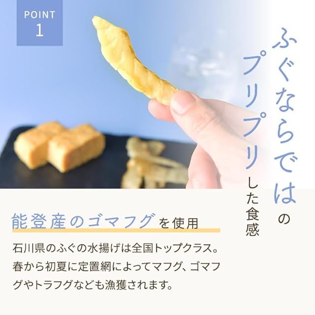ふぐならではのプリプリした食感。石川県のふぐの水揚げは全国トップクラス。春から初夏に定置網によってマフグ・ゴマフグが多く漁獲され、トラフグなども漁獲されます。そんなふぐで有名な能登産のゴマフグを使用しています。