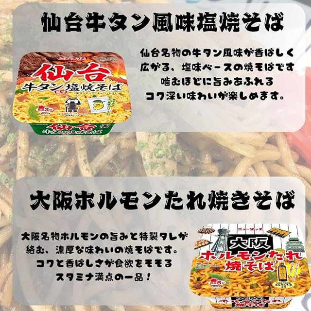 \バラエティ豊かな味が楽しめる、カップ麺セット/<br> <br> 定番の焼きそばを中心に、ユニークな味も揃っており、「もっと食べたくなる」「味をいろいろ試したい方におすすめ」とご好評いただいています。<br> <br> カップラーメン好きにはたまらないラインナップで、日常の軽食としてはもちろん、保存食や非常食としても便利。<br> 忙しいときやちょっとした空腹時にサッと食べられる手軽さが魅力です。<br> <br> おもしろさと美味しさを兼ね備えたこのセットは、自分用にもご家族用にも最適。<br> カップ麺の新しい魅力を、ぜひご堪能ください。<br> <br> <br> 【商品内容】 <br> ・日清 焼そばUFO <br> 「ぶっ濃い濃厚ソース」がうまい、「日清焼そばU.F.O.」。具材は、大切りキャベツと豚肉、別添で青のりと紅生姜のふりかけ付です。<br> <br> ・明星一平夜店の焼そば <br> マヨネーズのコクがアップした、一平ちゃんオリジナルからしマヨネーズがソースの旨さを引き立てる!<br> 最大の特徴である「からしマヨネーズ」を強化して、最高にうまい一平ちゃんへ進化します!<br> <br> ・明星一平ちゃん夜店の焼そば豚旨塩だれ<br> コクのある旨みのオニオンねり込み麺に、ごま油の風味をきかせガーリックマヨネーズで仕上げるやみつき塩だれ味。具材はキャベツ。ふりかけは、ブラックペッパー、あおさ、チリを組合せました。<br> <br> ・明星一平夜店の焼そば旨辛明太子味 <br> コクのある旨みのオニオンねり込み麺を使用。醤油バター風味の明太子味ソースに、明太子マヨで濃厚な味わい。具材はキャベツ。ふりかけは顆粒明太子、刻み海苔、トウガラシ粉末を組合せました。<br> <br> ・マルチャンごつ盛りソース焼そば <br> 麺130g、旨みとコクのあるブレンドソースに「キユーピーからしマヨネーズ」が付いた大盛ソース焼そば。<br> <br> ・マルチャンごつ盛り塩焼そば <br> 麺130g、チキンと玉ねぎの旨みが利いた塩味ソースに「バジル入り特製スパイス」が付いた大盛塩焼そば。<br> <br> ・ヤマダイ大阪ホルモンたれ焼きそば<br> ・地元大黒ソース製造の元祖通天閣謹製ホルモンたれを使った焼そば!<br> ・モッチリとした弾力のある油揚げ麺<br> ・パッケージの通天閣が目印です<br> <br> ・仙台牛タン風味塩焼そば<br> ・具材に牛タンチップを使用!<br> ・牛タン焼き風の風味豊かな塩タレ<br> ・特製スパイスでさわやかな美味しさに!<br> <br> ・サッポロ一番オタフクお好みソース味焼きそば<br> まろやかな味わいのオタフクお好みソースを使用した、風味豊かな焼そばです。<br> 当社独自製法により、もっちりとした食感でちぢれの少ないストレートの中太めんです。<br> 濃厚なソースのなじみもよく、生めん風の食感のめんです。<br> オタフクソース株式会社と共同開発した果実や野菜の甘みが感じられるまろやかなソースに、炒めたソースと野菜の香ばしい風味を加えました。<br> 焼そばに定番のキャベツを具材に使用。あおさ、かつお節、煮干いわし、さば節を使用した別添「ふりかけ」を添付しました。<br> <br> ・サッポロ一番塩カルビ味焼そば <br> ビーフのうまみと瀬戸内産レモンの果汁の爽やかな酸味と風味が特徴の塩カルビ味焼そばです。<br> 当社独自製法により、しっかりとしたコシと弾力のあるめんに仕上げました。適度なちぢれをつけた、ソースがよく絡むめんです。<br> ビーフのうまみに黒コショウの辛みやガーリックの風味を合わせ、隠し味に瀬戸内産レモン果汁の爽やかな酸味をきかせた、塩味の焼そばソースです。<br> 具材はキャベツと味付牛肉加工品の組み合わせです。味付牛肉加工品は、当社独自製法を採用し、香ばしい調理感を実現しました。<br> ※粉末レモン果汁のレモン果汁のうち瀬戸内産レモンの果汁30%使用。<br> <br> ・日清ソース焼そばカップ チキンスープ付き<br> 紅ショウガの入ったスパイシーなソースが決め手の手軽に楽しめるカップ焼そば。湯切りのお湯で作る、チキンとオニオンのうまみがきいたチキンスープ付きで大満足の一品です。<br> <br> <br> ※注意事項※ 商品の構成やパッケージは、メーカー様の終売や改廃に伴って予告なく変更となります。 写真や説明文と異なるお味をお届けする場合がございます。 商品説明や成分表示などは改廃に伴って変更となる場合があります。正しくはお届けする商品をご覧ください。 上記をあらかじめご理解の上、お買い求めください。