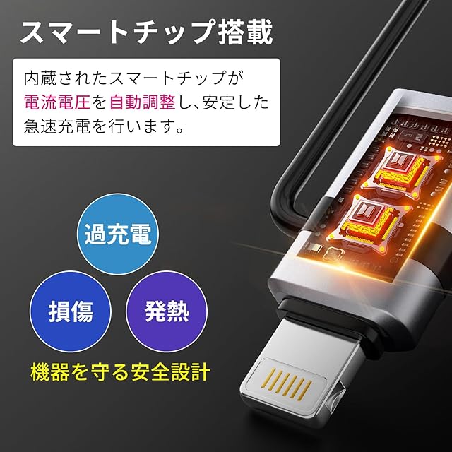 【スマートチップ搭載】 内蔵されたスマートチップが接続した機器の電流電圧を自動調節し、安定した急速充電を行います。過充電・損傷・発熱を防ぐ安全設計です。