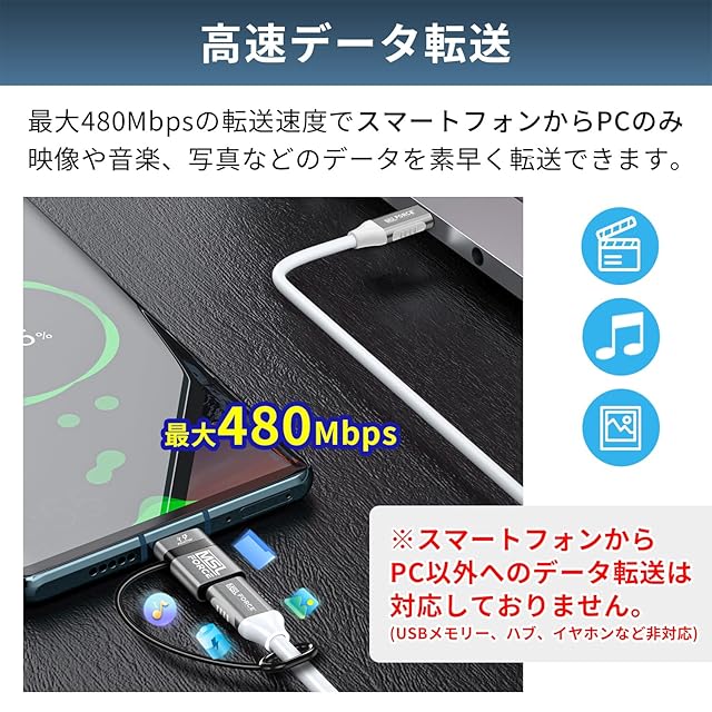 【高速データ転送】 最大480Mbpsの転送速度でスマートフォンやタブレットからPCへ映像や音楽、写真などのデータを素早く転送できます。データ転送しながら同時に急速充電も可能です。※OTG機能に対応していない為、スマートフォンまたはタブレットからPC以外のデバイスにデータ転送できません。